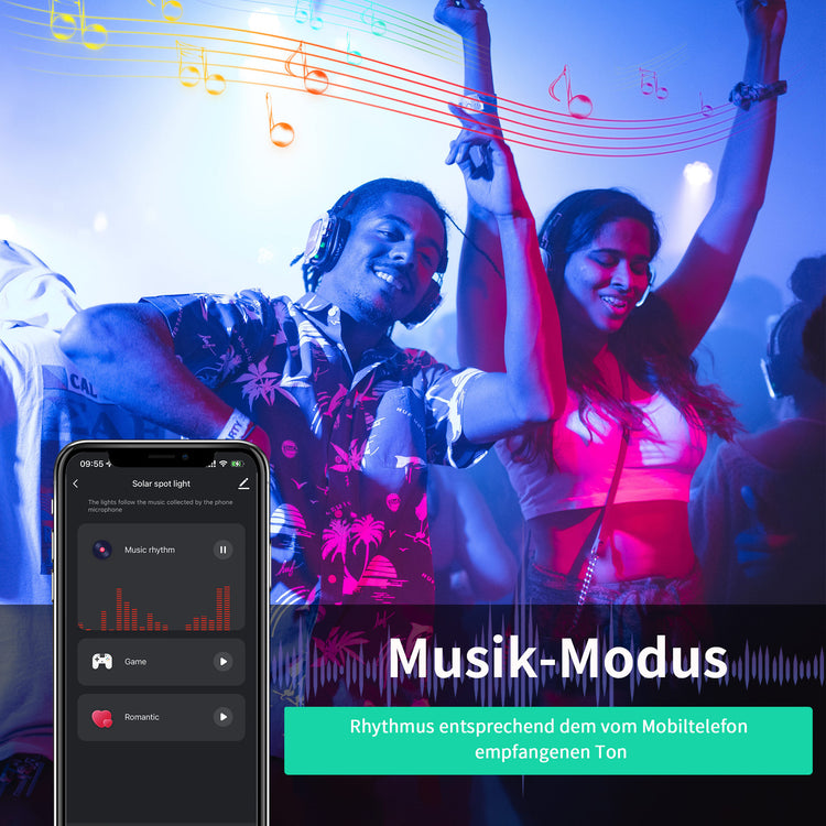 Die Solarleuchten können auf den "Musikmodus" eingestellt werden und ändern die Farben im Takt der Musik, aber auch die Beleuchtung ändert sich automatisch mit der Lautstärke des Sounds, perfekt für Partys und Veranstaltungen.