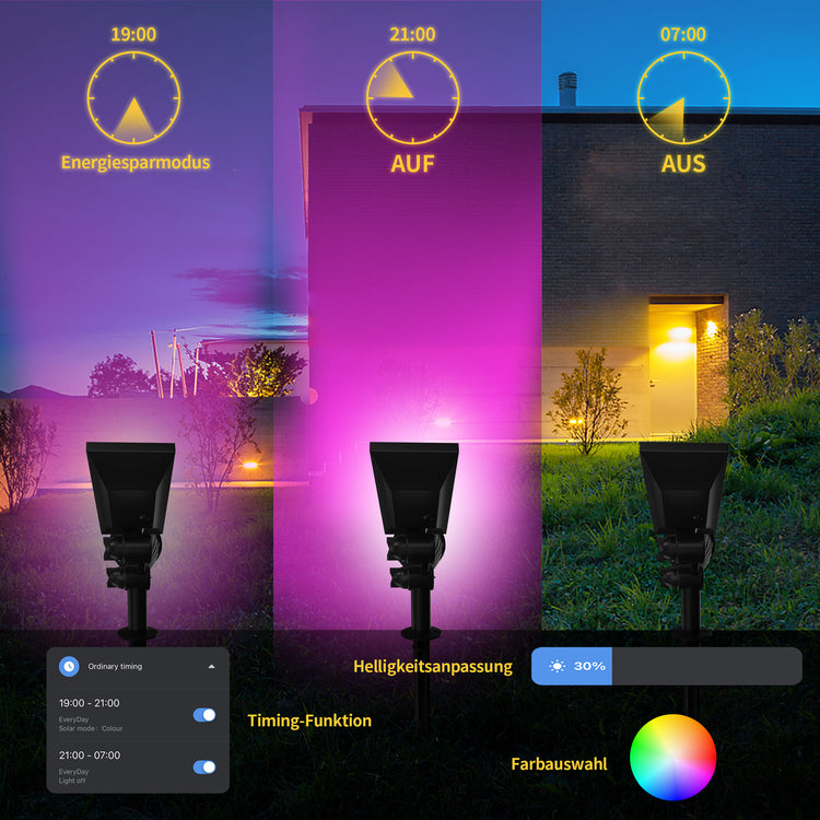 Die intelligenten RGB-LED-Solarleuchten verfügen über 16 Millionen Farben. Sie können für jede Lampe individuell die Farbe oder den Modus einstellen. Sie können auch die Außenleuchten so einstellen, dass sie zu bestimmten Zeiten ein- oder ausgeschaltet werden und die Helligkeit zwischen 1% und 100% anpassen, um verschiedenen Beleuchtung.