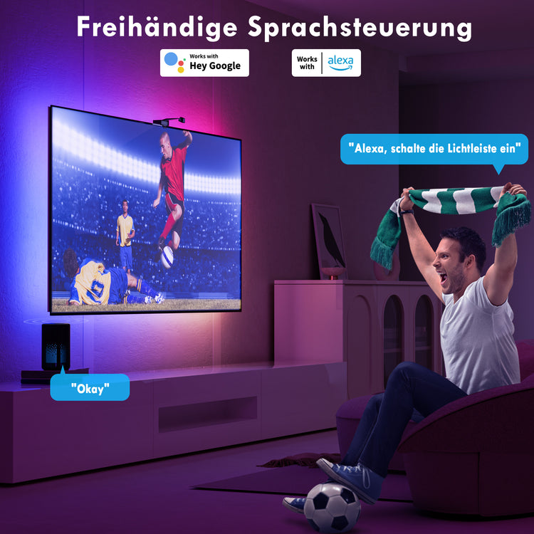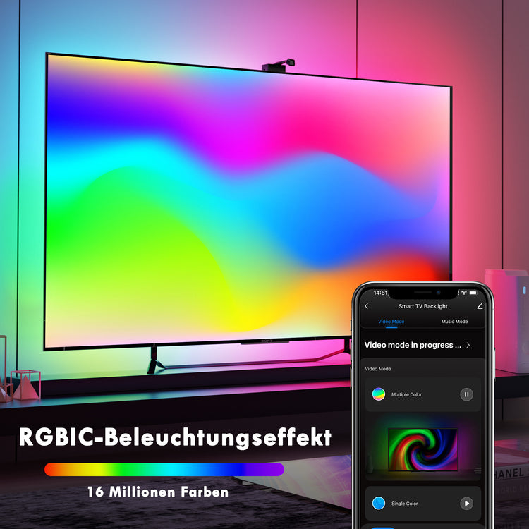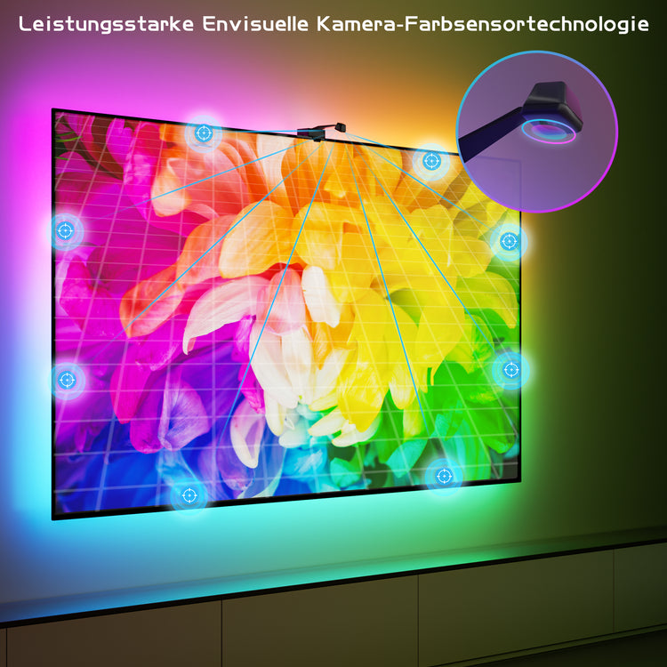 Mit einer 1080P intelligenten Kamera kann dieses fortschrittliche Ambient TV Backlight jede Farbe auf dem TV verfolgen. Erweitern Sie Ihr Heimkino damit und lassen Sie Ihre Lichter mit dem Inhalt auf Ihrem Bildschirm tanzen, blinken, dimmen und aufhellen. Erleben Sie das ultimative immersive Audio-Visual-Ambiente mit Familie und Freunden.