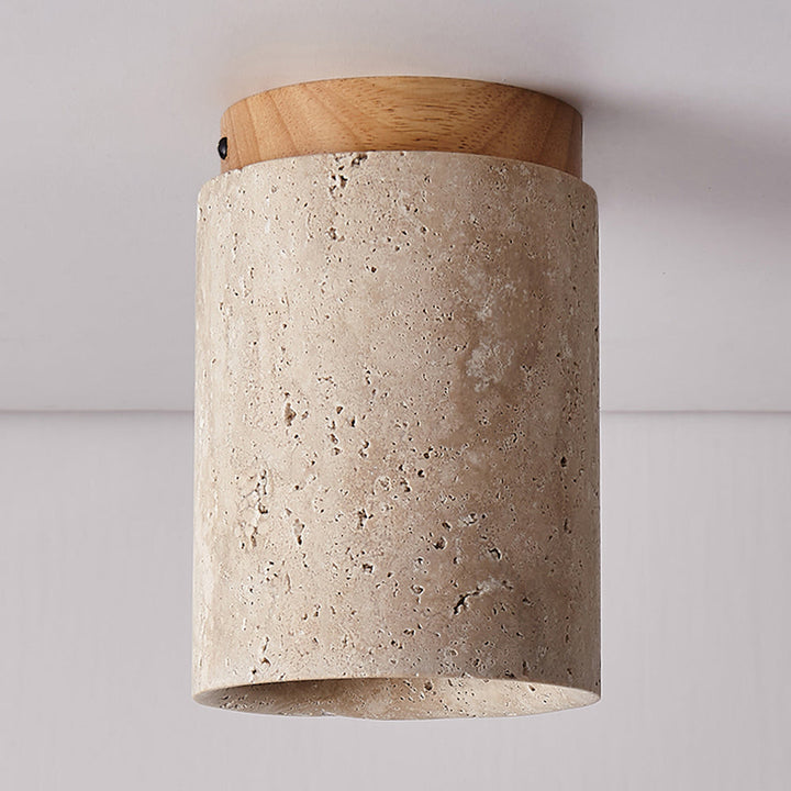 - Diese hölzerne Deckenlampe ist mit natürlichem gelbem Travertin handpoliert, und das Licht scheint durch unregelmäßig strukturierte Kristalle, wie das herrliche Glühen des Sonnenuntergangs in der untergehenden Sonne. Ein natürliches und seltenes Spektakel ist berauschend.