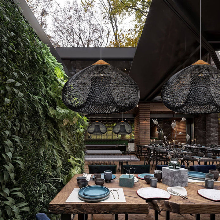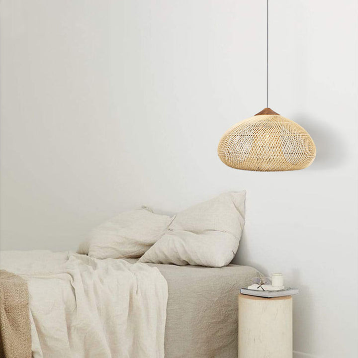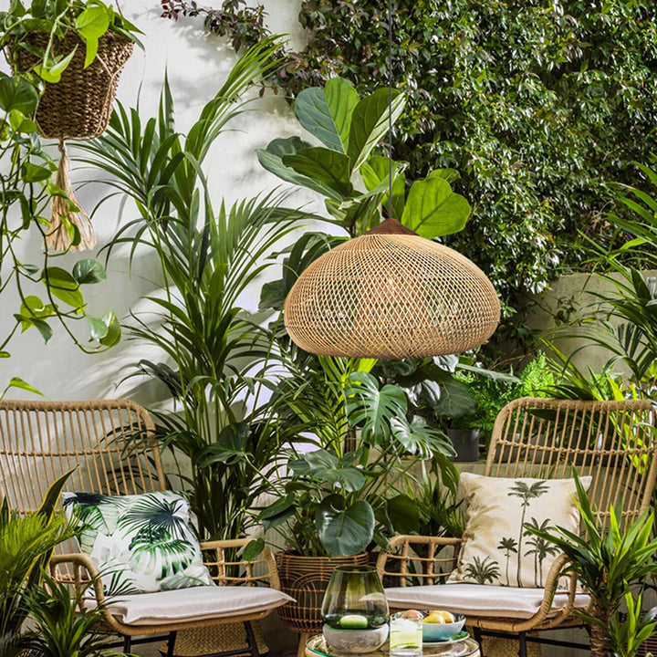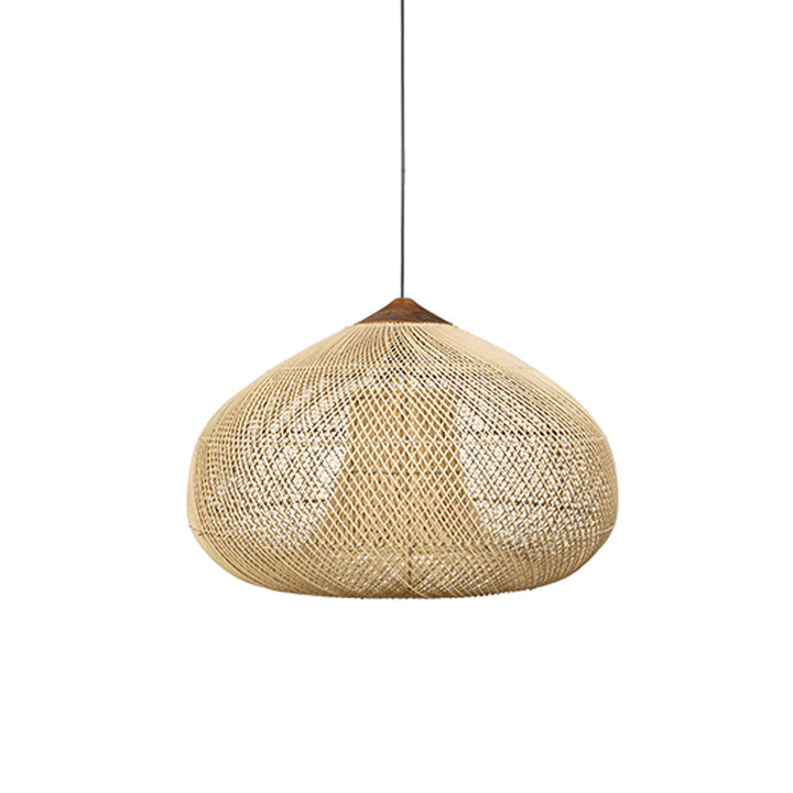 - Diese runde Pendelleuchte ist aus natürlichem Rattan und Holz gefertigt, die Rattanstreifen sind kreuz und quer angeordnet. Eine zusätzliche Schicht aus einem kleinen runden Lampenschirm ist der inneren Schicht hinzugefügt. Das Licht ist warm, mild und nicht blendend. Die Qualität verleiht den Lampen einen schwachen Duft, als ob sie die Natur ins Haus bringen würden, so dass sich die Menschen entspannt und wohl fühlen.