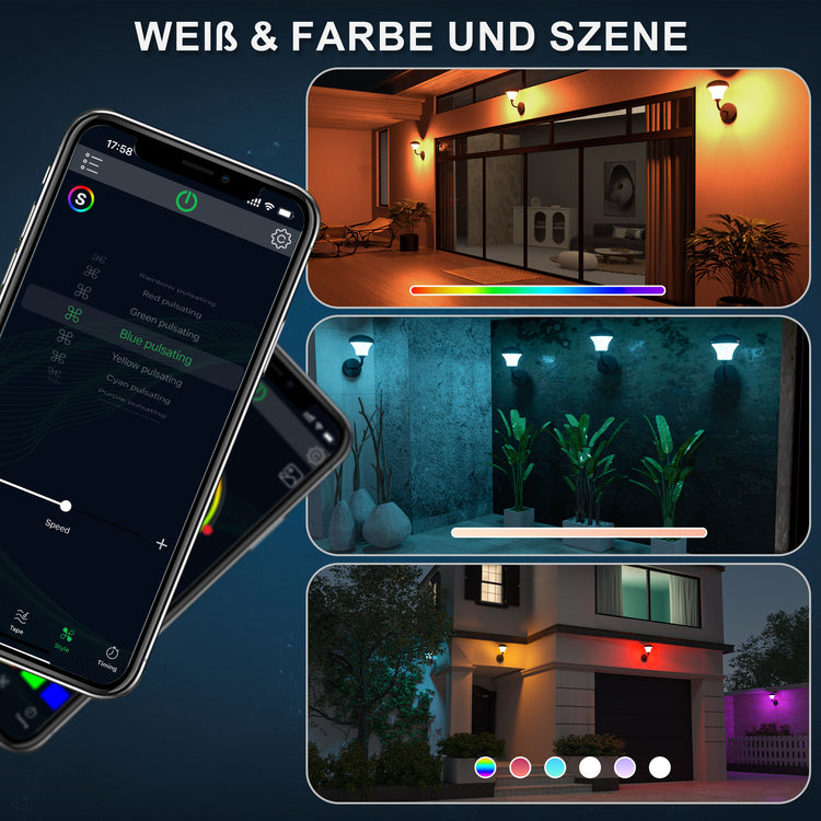 Die RGB Smart Outdoor-Wandleuchte eignet sich perfekt für Cafébeleuchtung, Hochzeitsfeiern, Gartendekoration usw. und schafft eine gemütliche und warme Beleuchtungsatmosphäre.