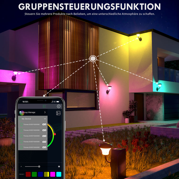 Unsere RGB Smart Outdoor Wandlampen können gleichzeitig gesteuert werden, um ein komplettes lokales Smart-System aufzubauen, das viel stabiler und zuverlässiger ist. Steuern Sie alle Lampen einfach als Gruppe gleichzeitig. Gruppensteuerung der Wandlampe für eine farbenfrohere Darstellung.